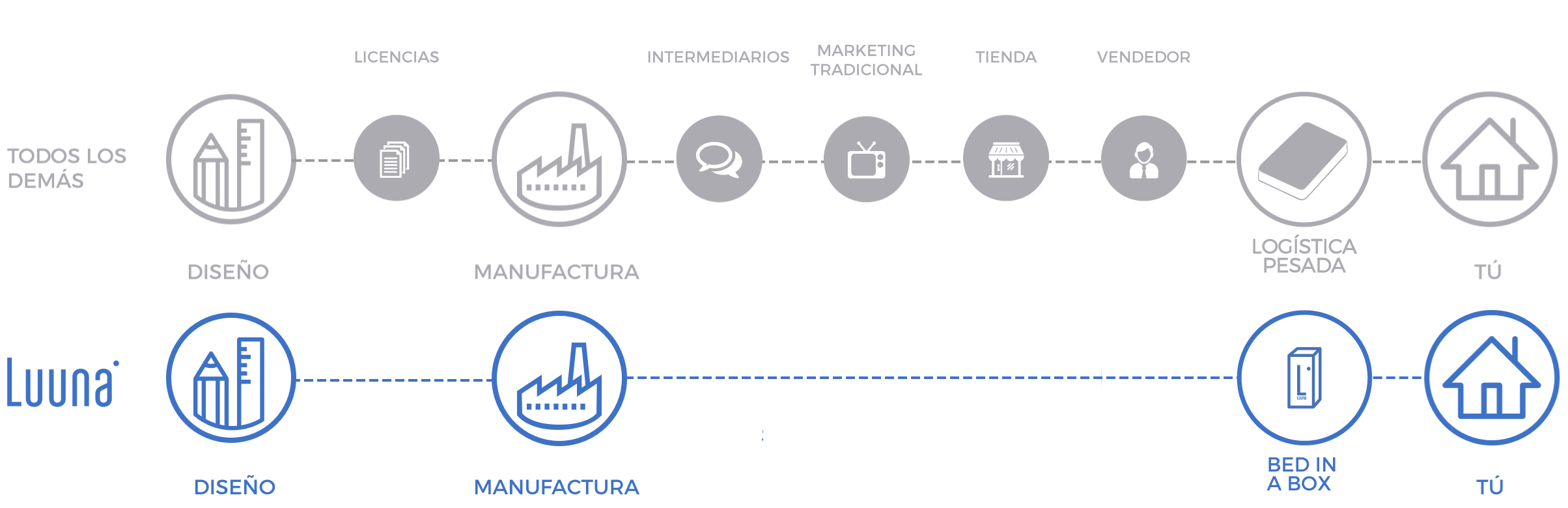 El colchón Luuna llega directo de la fábrica a tu casa con el objetivo de que el usuario pague el menor precio posible, sin pasar por todo lo que hace caro a un colchón convencional.