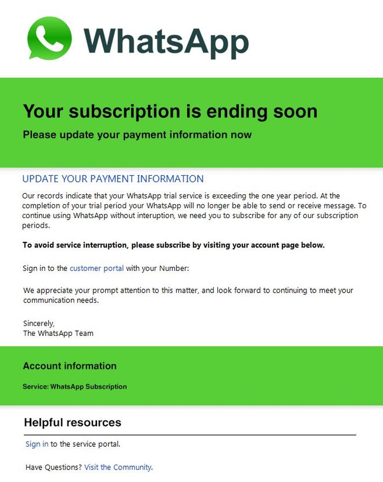 Hay criminales que esperan a una persona despistada que haya olvidado que la suscripción a WhatsApp es totalmente gratis. El envío de mensajes supuestamente oficiales en los que se pide al usuario los datos de su tarjeta para que pague la suscripción. Es importante tener en mente que este de servicio de mensajería dejó de cobrar suscripción desde 2016.