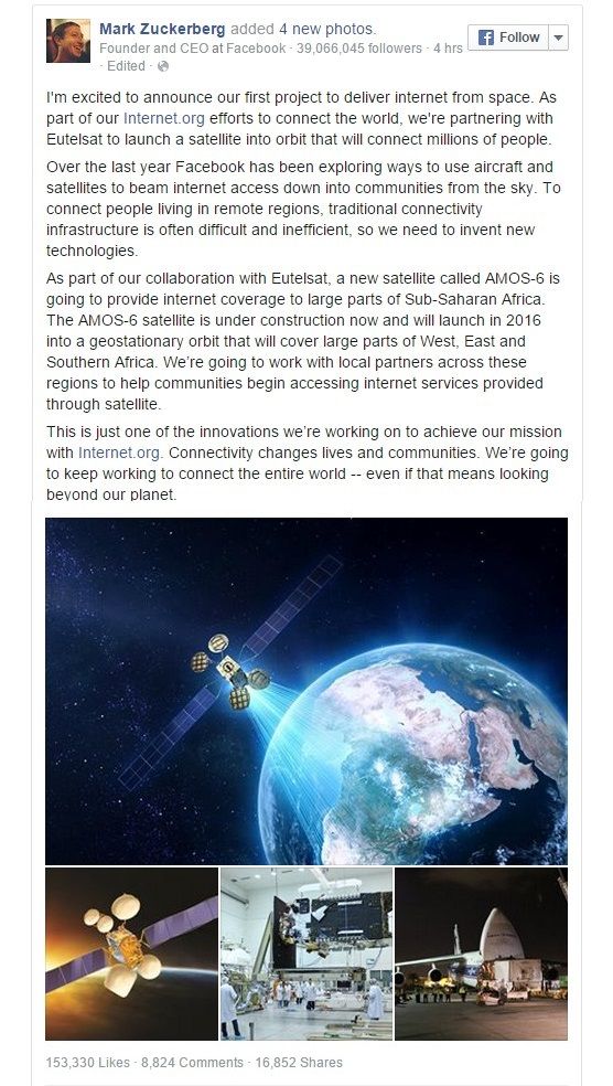“Estoy emocionado de anunciar nuestro primer proyecto para entregar internet desde el espacio. Como parte de nuestros esfuerzos para conectar el mundo a través de Internet.org, nos estamos asociando con Eutelsat para lanzar un satélite en órbita que conecte a millones de personas”, escribió el creador de Facebook en su perfil de la red social.