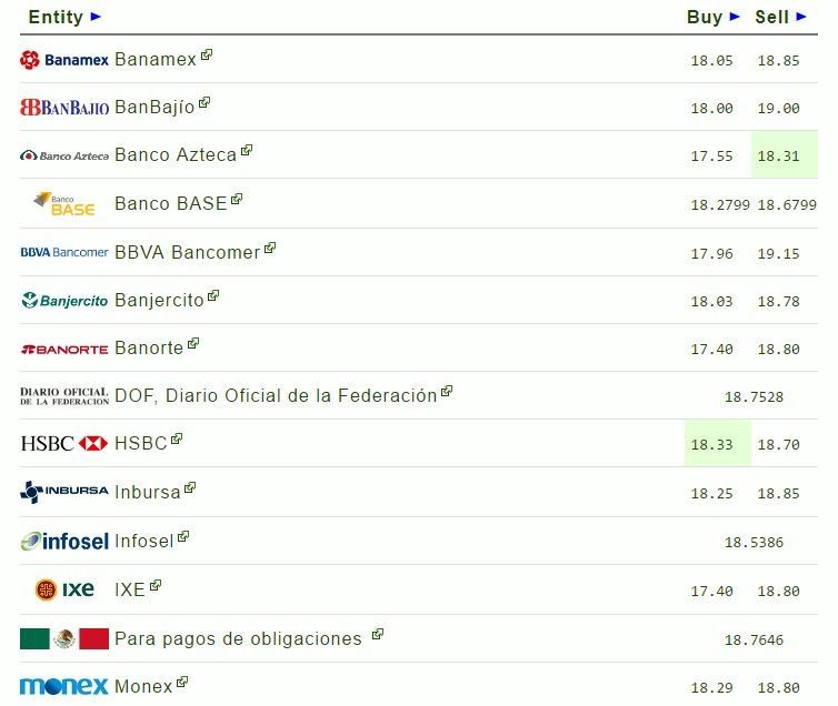 Al inicio de la semana, el dólar se vende hasta en 19.15 pesos en bancos de la Ciudad de México y se adquiere en un precio mínimo de 17.40 pesos.