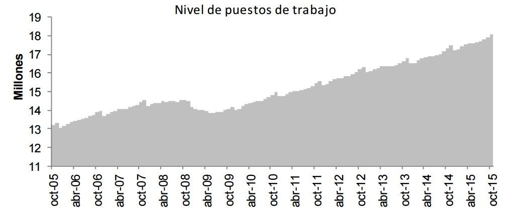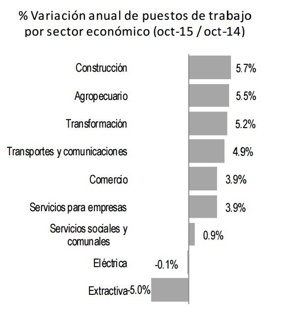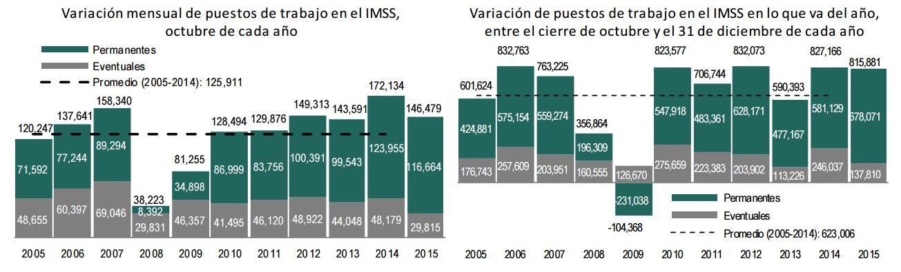 Al 31 de octubre de 2015, la barrera de los 18 millones de empleos formales en el Instituto Mexicano del Seguro Social (IMSS) fue superada ya que llegó a una afiliación de 18 millones 55 mil 468 puestos de trabajo, de los cuales el 85.6 por ciento corresponde a plazas permanentes, así como 14.4 por ciento eventuales.