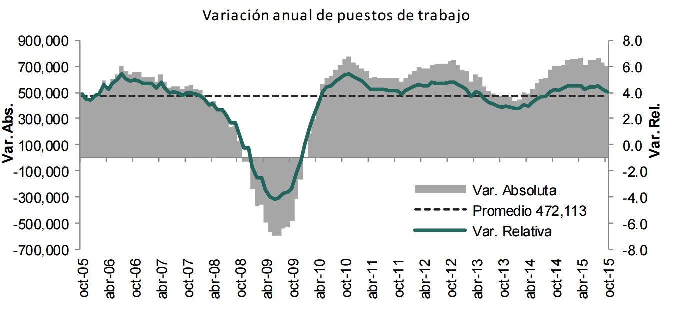 La variación del empleo en lo que va del año es de 815 mil 881 plazas, significando 11 ml 285 puestos menos que el aumento reportado en el mismo período del año pasado, constando de 827 mil 166 plazas, así como 192 mil 875 plazas más que el crecimiento promedio reportado en el mismo período de los 10 años previos, que fue de 623 mil seis plazas.