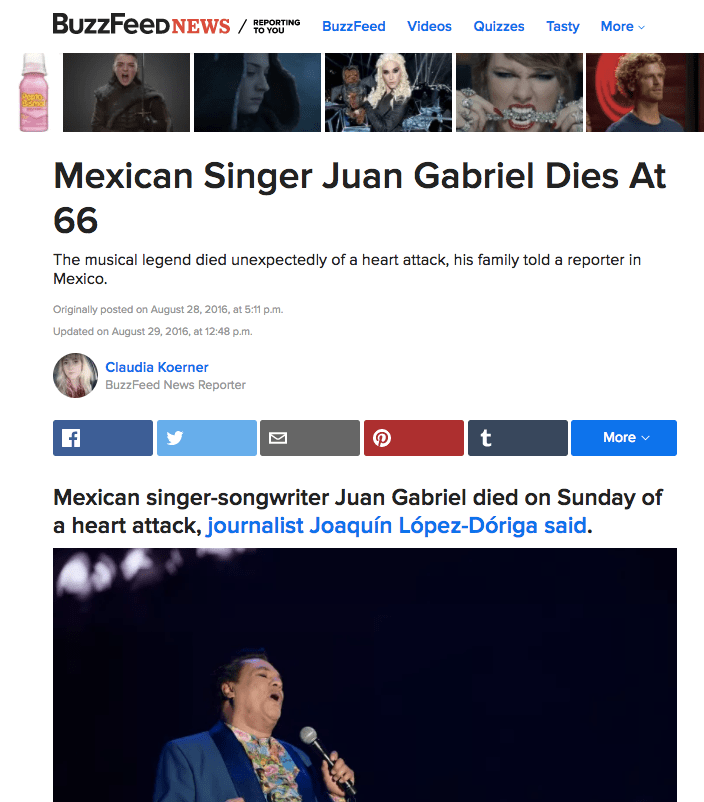 Tras la ampliación de la información, medios tanto locales como internacionales narraron y lamentaron lo ocurrido, así como detallaron el legado musical del intérprete de ‘Querida’ en la cultura tanto nacional como latinoamericana, y detallaron al astro con calificativos de “ícono” y “superestrella”. Incluso el medio El País calificó en su editorial a Juan Gabriel como ‘un estado del alma’.