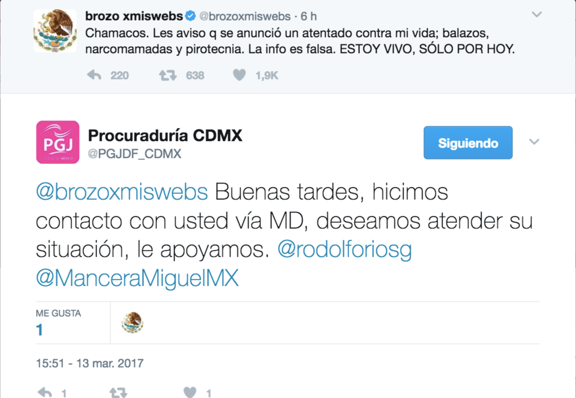 Por su parte, en Twitter escribió: “Chamacos. Les aviso q se anunció un atentado contra mi vida; balazos, narcomamadas y pirotecnia. La info es falsa. ESTOY VIVO, SÓLO POR HOY”.