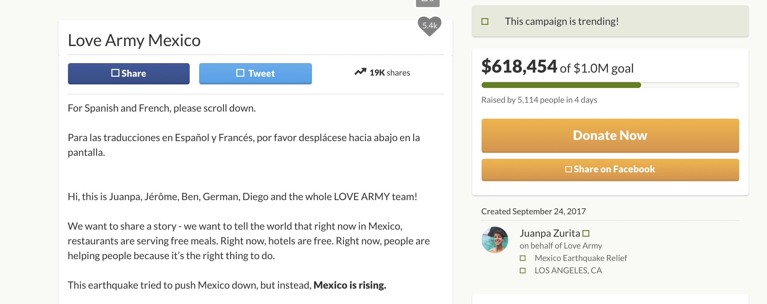 “Queremos reunir el primer millón de dólares para la construcción de 100 viviendas, hoy tenemos aproximadamente US $500,000 pero necesitamos llegar a la primera meta para iniciar el proyecto de reconstrucción a través de la plataforma GoFundMe cuenta #LoveArmyMexico… Puedes unirte a nuestra causa y si logramos más, construiremos más”.