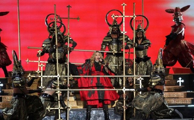 Mientras, la cantante bailaba junto a ellas y ofrecía el tema “Holly water”, que luego se transformó en el clásico “Vogue”, para terminar en una mesa simulando la última cena de Cristo en donde fue cargada y ofrecida como un banquete sensual.
