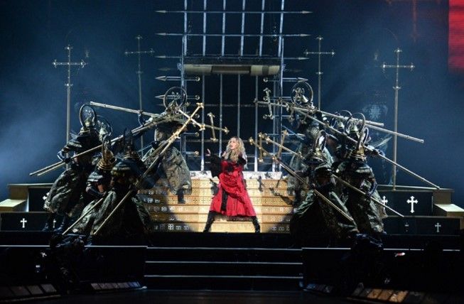 Custodiada por los samuráis vestidos de dorado y grandes cruces, la diva de 57 años, que usó un vestido rojo con toques negros y su largo cabello rubio suelto, hizo la coreografía del primer tema de esta gira en la que la energía electrónica tomó gran fuerza.