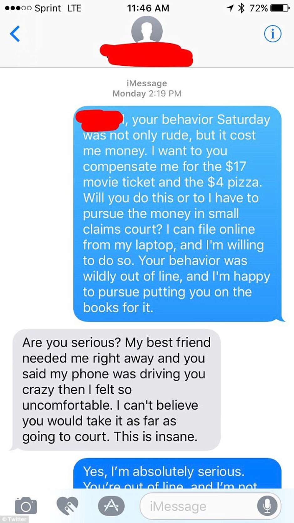 Tras el altercado, el demandante buscó insistentemente a la mujer para recibir el reembolso de la entrada, llegando incluso a contactarse con su hermana menor.