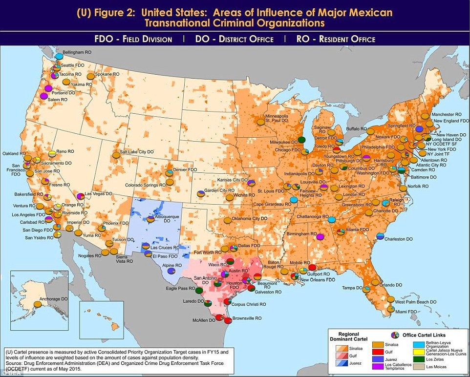 De acuerdo a un informe no clasificado de la Drug Enforcement Administration (DEA) que muestra la influencia de los cárteles de droga mexicanos en territorio estadounidense, el imperio de Joaquín “El Chapo” Guzmán es tan amplio, que domina la mayor parte del tráfico de drogas ilícitas en los Estados Unidos.