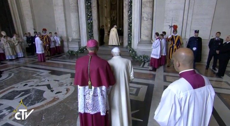 Al llegar a la galería el líder católico se acercó a su antecesor, Benedicto XVI, quien se encontraba sentado en una esquina y lo saludó, después se ubicó frente al gran portón de San Pedro donde comenzó el rito de apertura.