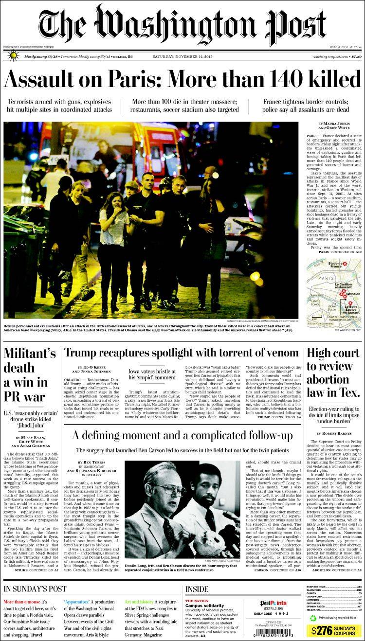 Por su parte, “The Washington Post”, también dedica su portada al tema, titulando su nota “Ataque en París: más de 140 personas asesinadas”, el cual también ilustra con un mapa que muestra los lugares donde se registraron ataques.