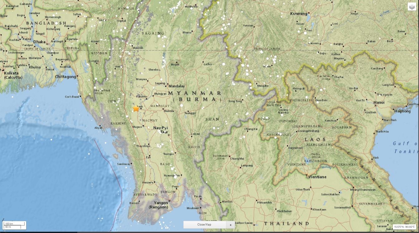 Este mismo día, un sismo de magnitud provisional 6.8 ha remecido al centro de Myanmar, así lo afirman funcionarios locales y confirmado por el Servicio Sismológico de Estados Unidos (USGS, por sus siglas en inglés).
