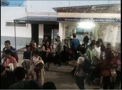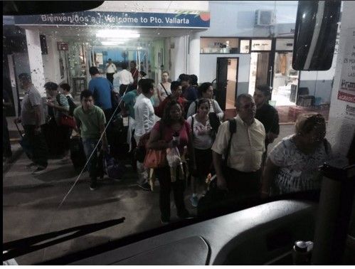 En la terminal de Vallarta, cientos de pasajeros intentan cambiar sus vuelos y se desplazan hacia la terminal de autobuses para llegar a sus destinos.