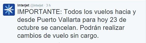 La aerolínea Interjet informó a través de su cuenta de Twitter: “todos los vuelos hacia y desde Puerto Vallarta para hoy 23 de octubre se cancelan. Podrán realizar cambios de vuelo sin cargo”.