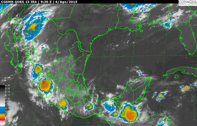 Se esperan precipitaciones muy fuertes, chubascos, actividad eléctrica, posible caída de granizo y vientos fuertes en Nayarit, Jalisco, Michoacán y Guerrero; y fuertes en Sinaloa, Durango, Colima, Estado de México y Puebla, anunció el Servicio Meteorológico Nacional (SMN).