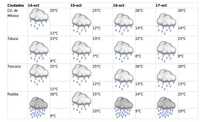 Para la Mesa Central se tendrá clima medio nublado a nublado, potencial de precipitaciones muy fuertes de 80 por ciento en Puebla, fuertes en Hidalgo y de menor intensidad en Guanajuato, Querétaro, Tlaxcala y Morelos, con formación de nieblas en zonas de valle y montaña.