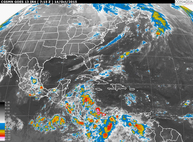Se espera el desarrollo de nublados con potencial de precipitaciones puntuales fuertes en Jalisco, Michoacán y Guerrero; de menor intensidad en Baja California, Baja California Sur, Sonora, Chihuahua, Aguascalientes, Zacatecas, Durango, Sinaloa, Nayarit, Colima, Guanajuato, Estado de México, Morelos y Distrito Federal.