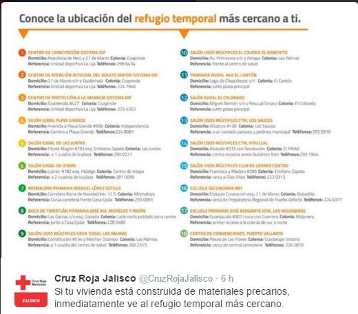 De igual forma, difundió la ubicación de los refugios temporales más cercanos si se vive en zonas bajas, de riesgo como en laderas, o cerca de la playa. Y puso a disposición de la ciudadanía los teléfonos en Jalisco 01-322-224-7701; Colima 01-312-313-0311; Nayarit 01-311-133-0381.